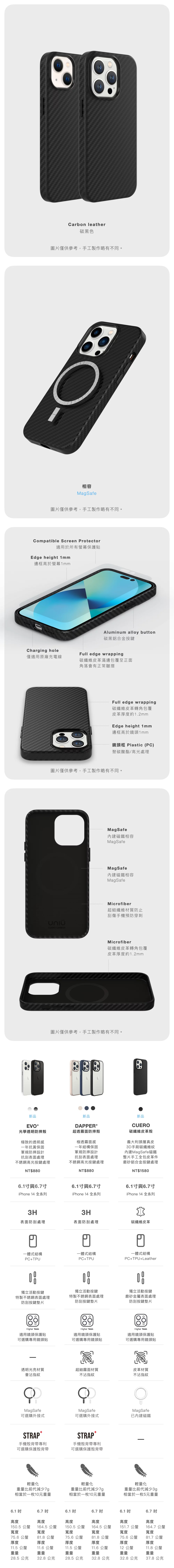 CUERO CARBON 碳纖維皮革-限量款。使用Mastrotto義大利碳纖維頭層皮革,表層防刮耐磨3D刷紋處理,輕度防潑水效果,延緩改善皮革老化問題。長達46項複雜製作工序,日產量稀少,內建MagSafe系統,可兼容相關配件。