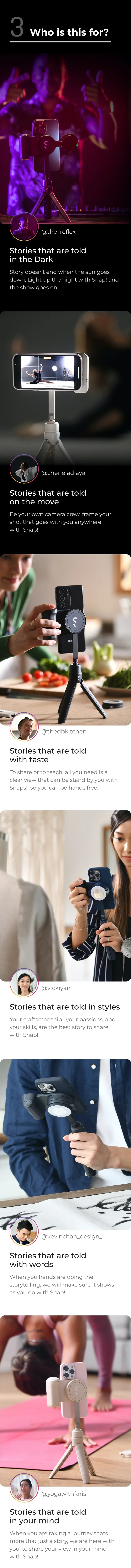 SnapGrip擁有 DSLR 單鏡反光相機的手感,但體積小巧,無線快門按鈕可以讓你在移動中輕鬆地拍照。 它還兼作 Qi 無線移動電源,可在拍攝過程中為手機充電。 它的樞軸系統令手機橫向和縱向轉動切換變得簡單,無論是狂熱的 Instagram 用戶、explodeTikTok 的狂熱愛好者、Facebook 粉絲還是熱衷於與他人分享烹飪技巧,SnapGrip 都讓激情發揮。 Snaplight 有助於消除陰影並提供柔和、均勻的照明或補光,它可以根據前置或後置攝像頭的方翻轉,並且有四個亮度級別可供選擇。 SnapPod 可用作桌面底座或視頻自拍杆,讓完美自拍或FaceTime 通話變得輕而易舉。